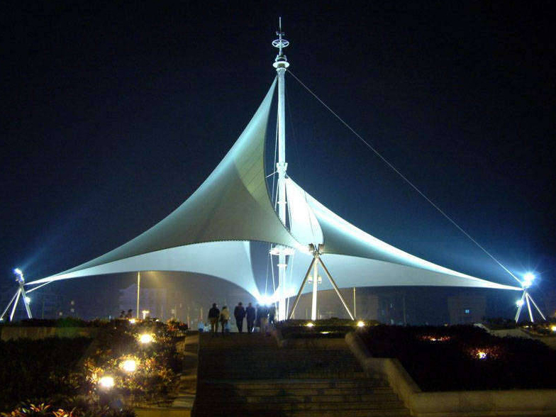 景觀膜結構 景觀膜結構又稱張拉膜景觀,主要通過膜結構的張拉式 呈現(xiàn)出唯美的結構特征;膜材料是指聚酯纖維基布或PVDF、PVF、PTFE等不同的表面涂層,配以優(yōu)質的PVC組成的具有穩(wěn)定的形態(tài),并可承受一定載荷的建筑紡織品。它的壽命因不同的表面涂層而異,一般可達成10-20年;其外觀整潔大方,自潔性強。主要應用于各大公園,世博園,和一些廣場,商場等場所。