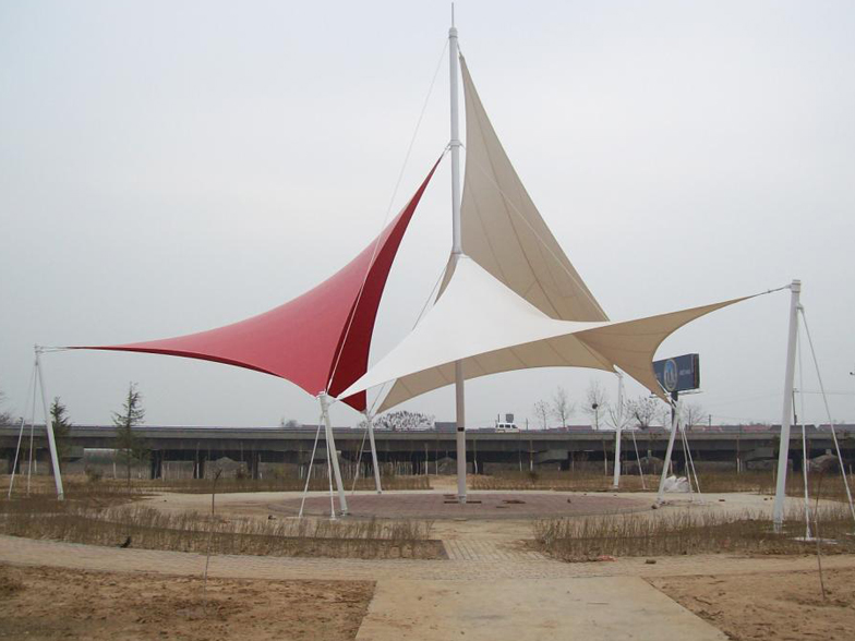 景觀膜結(jié)構(gòu)又稱張拉膜景觀,主要通過膜結(jié)構(gòu)的張拉式 呈現(xiàn)出唯美的結(jié)構(gòu)特征;膜材料是指聚酯纖維基布或PVDF、PVF、PTFE等不同的表面涂層,配以優(yōu)質(zhì)的PVC組成的具有穩(wěn)定的形態(tài),并可承受一定載荷的建筑紡織品。它的壽命因不同的表面涂層而異,一般可達(dá)成10-20年;其外觀整潔大方,自潔性強(qiáng)。主要應(yīng)用于各大公園,世博園,和一些廣場,商場等場所。