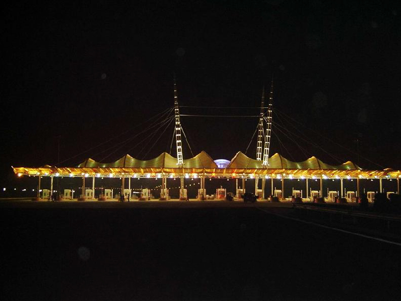 呼和浩特收費站膜結(jié)構(gòu) 出入口膜結(jié)構(gòu)是采用膜與鋼結(jié)構(gòu)的一種結(jié)合呈現(xiàn)出的新形出入口的一種新形建筑,膜材料是指聚酯纖維基布或PVDF、PVF、PTFE等不同的表面涂層,配以優(yōu)質(zhì)的PVC組成的具有穩(wěn)定的形態(tài),并可承受一定載荷的建筑紡織品。它的壽命因不同的表面涂層而異,一般可達成10-20年;其外觀整潔大方,自潔性強。主要應(yīng)用于各大出入口,收費站等場所。